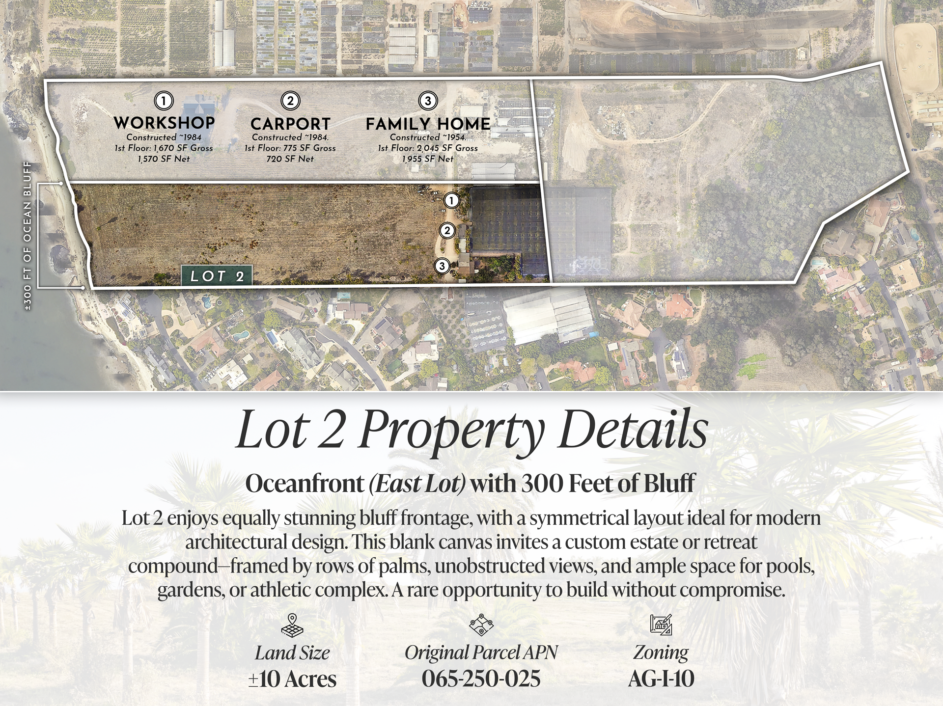 Lot 2 enjoys equally stunning bluff frontage, with a symmetrical layout ideal for modern architectural design. This blank canvas invites a custom estate or retreat compound—framed by rows of palms, unobstructed views, and ample space for pools, gardens, or sport courts. A rare opportunity to build without compromise.