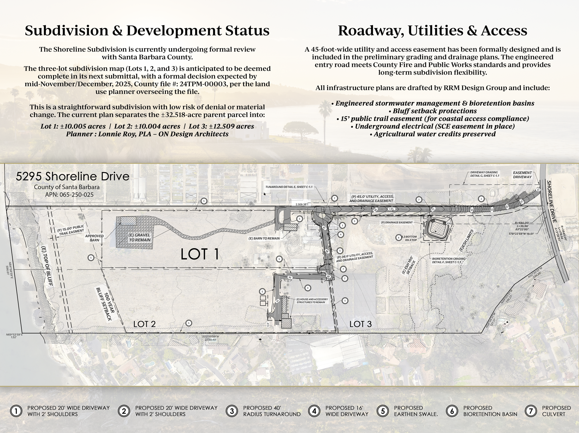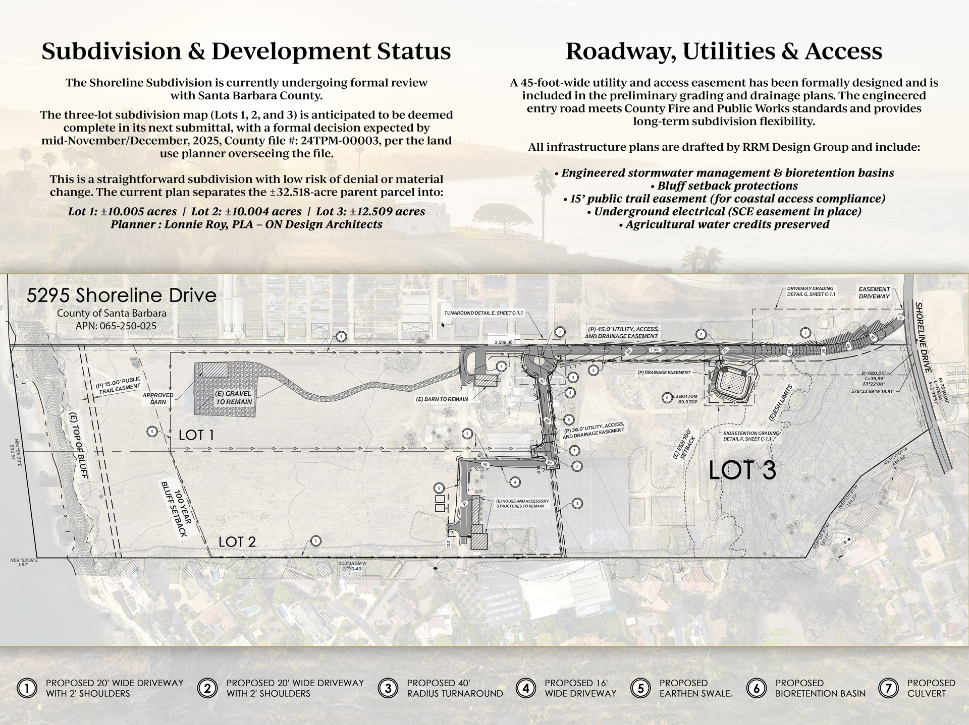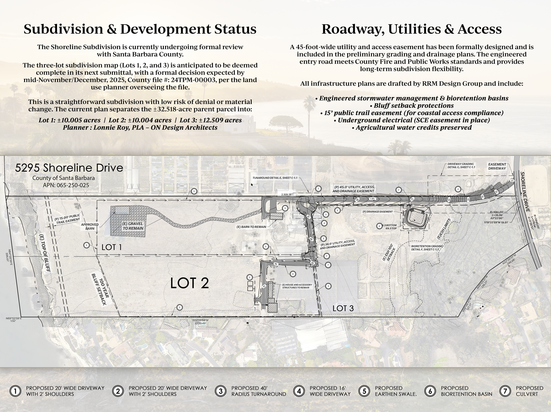 The Shoreline Subdivision offers approximately 600 feet of combined oceanfront bluff, with Lot 1 and Lot 2 each enjoying \~300 feet of frontage. With subdivision approval underway and infrastructure plans in place, now is the time to take the next step.