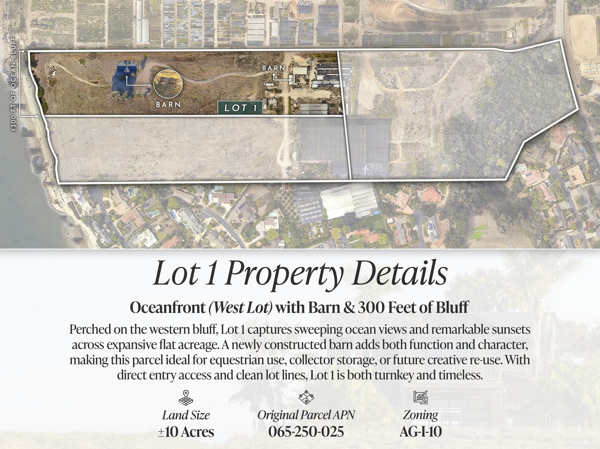 Perched on the western bluff, Lot 1 captures sweeping ocean views and remarkable sunsets across expansive flat acreage. A newly constructed barn adds both function and character, making this parcel ideal for equestrian use, collector storage, or future creative re-use. With direct entry access and clean lot lines, Lot 1 is both turnkey and timeless.