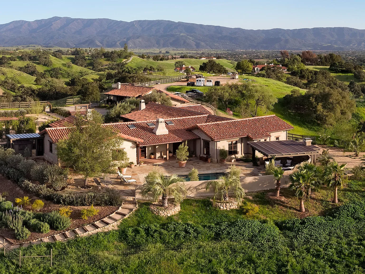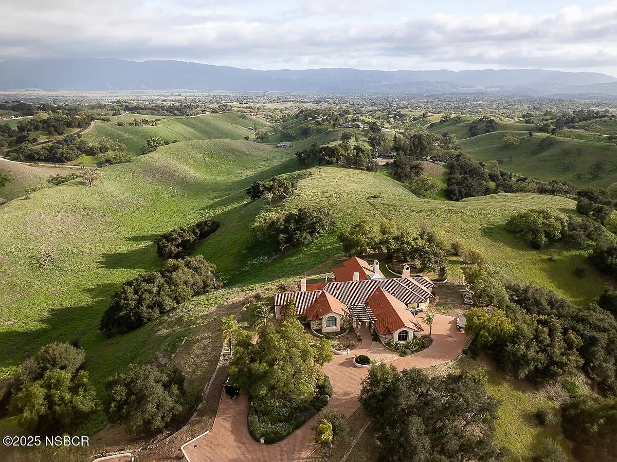 Breathtaking views, privacy and plenty of open space surround this hilltop estate compound. Spanish hacienda and modern sophistication combine on this 20 +/- acre estate located in Rancho Ynecita just minutes from Los Olivos.